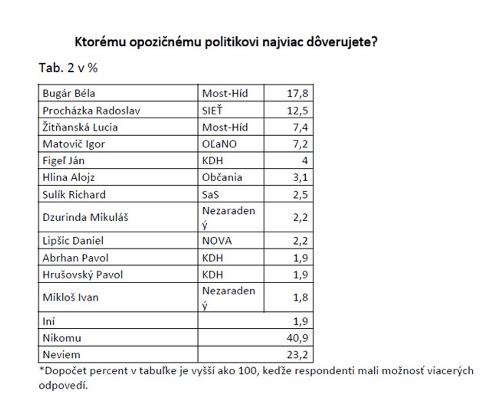 Z prieskumu tiež vyplynulo, že najdôveryhodnejším opozičným politikom je šéf Most-Híd Béla Bugár, pred Radoslavom Procházkom (Sieť) a Luciou Žitňanaskou (Most - Híd).