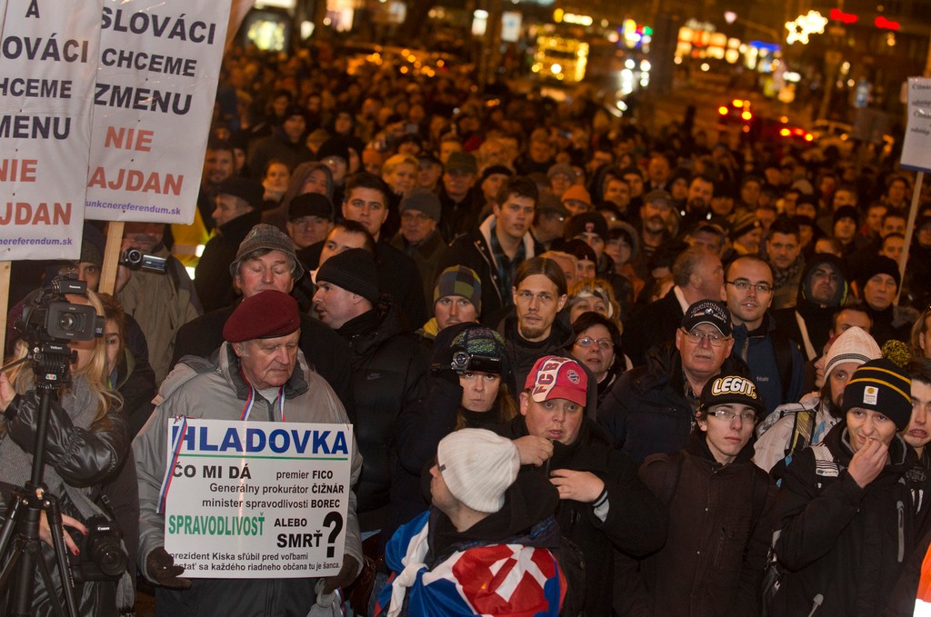 Ľudia dnes v centre Bratislavy žiadali stop korupcii a rozkrádaniu štátnych peňazí. Nespokojnosť so súčasným fungovaním štátu prišlo vyjadriť v podvečerných hodinách na námestie SNP asi do 2000 protestujúcich. Ľudia držali v rukách transparenty s nápismi ako "Nie sme ovce" alebo "Fico odstúpiť". Dav niekoľkokrát pokrikom vyzval Roberta Fica na odchod.