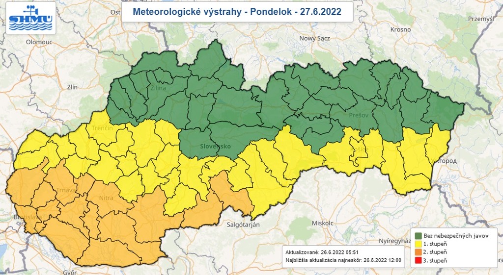 Vlna horúčav postupne prechádza na celé územia Slovenska už od tohto víkendu. V pondelok zasiahne západné a južné oblasti. Takzvané supertropické teploty do 36 stupňov Celzia môžu očakávať obyvatelia v 15 okresoch, a to napríklad v Bratislave, Malackách, Trnave, Senci, Leviciach, Veľkom Krtíši či v Lučenci. Teplotu do 34 stupňov Celzia budú mať obyvatelia Skalice, Trenčína, Zvolena, Rožňavy alebo Michaloviec. Výstrahy platia od 14.00 do 18 hodiny.