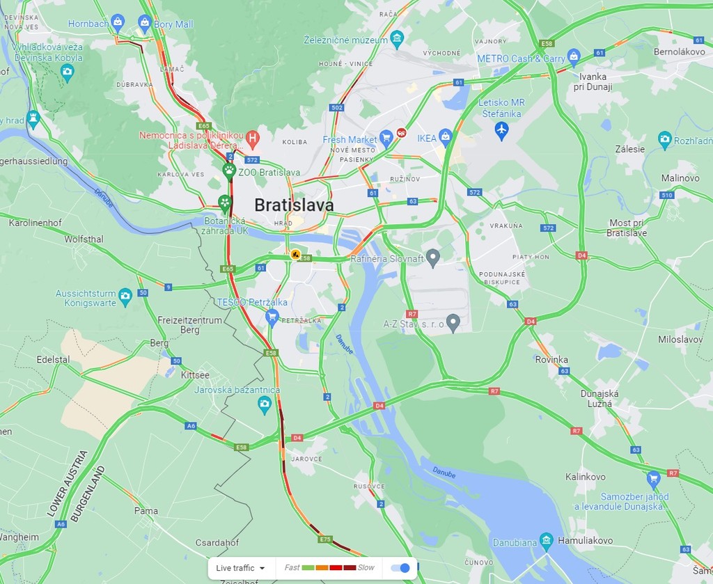 Mapa dopravnej situácie v Bratislave (16.15h)