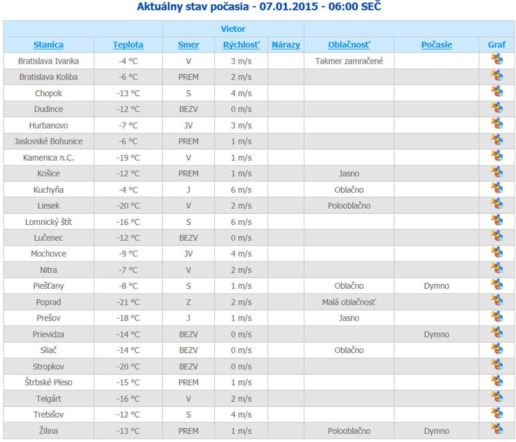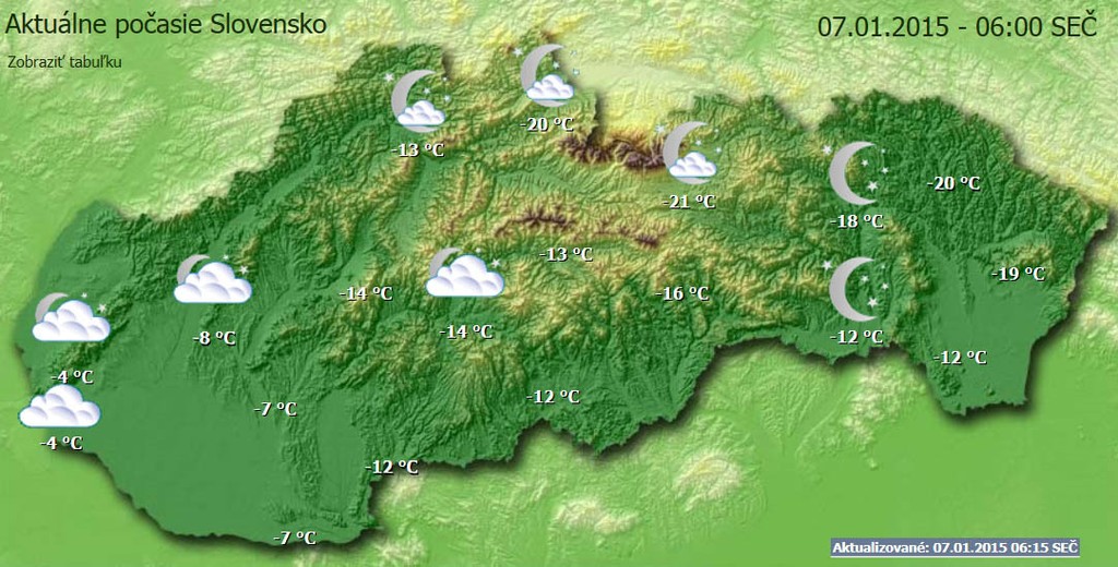 Mrázik udrel najmä na strednom a východnom Slovensku. Zdá sa, že najchladnejšie bolo dnes ráno v Poprade. Tu podľa Slovenského hydrometeorologického ústavu namerali -21 stupňov. Len o stupeň "teplejšie" (-20) bolo v Stropkove a tiež Lieseku). Na západe sa teploty pohybovali od -14 do -4 stupňov.
