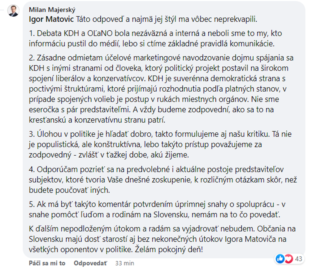 Neskôr sa vo vlákne objavila aj odpoveď samotného Majerského. Ten sa ohradil, že nič tajné do médií nepustili a nepáči sa mu, že ich Matovič účelovo spája s inými stranami.