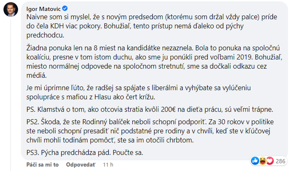 „Naivne som si myslel, že s novým predsedom (ktorému som držal vždy palce) príde do čela KDH viac pokory. Bohužiaľ, tento prístup nemá ďaleko od pýchy predchodcu,“ začal Matovič svoj komentár s tým, že mu prekáža, že v éteri lietajú odkazy cez média.
