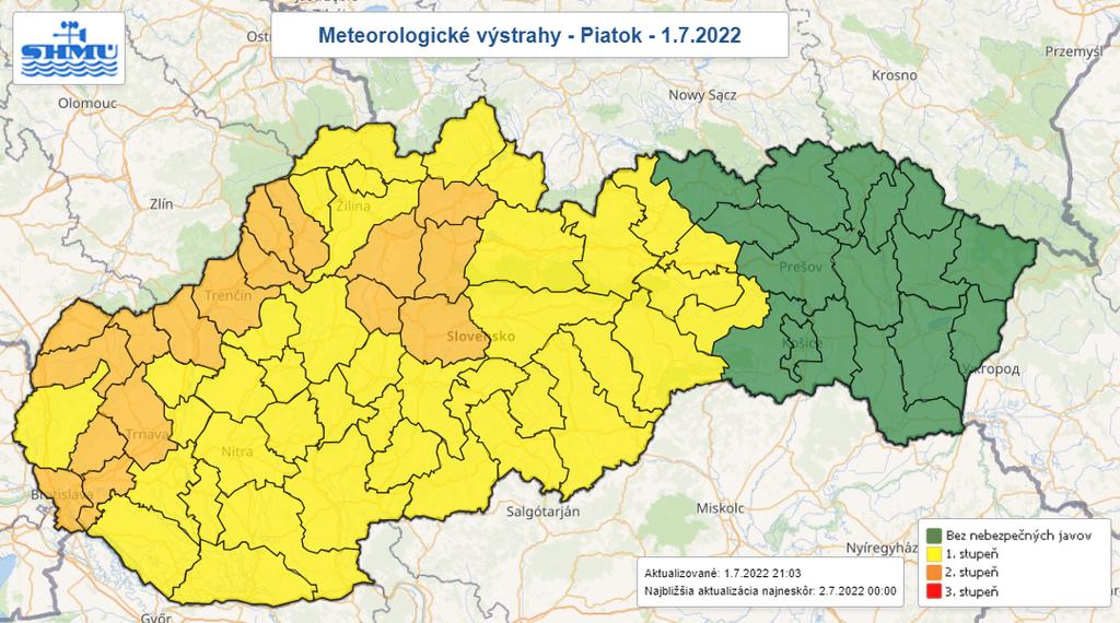 Výstraha druhého stupňa platí v daných oblastiach do 22.00 h. Búrky môžu byť podľa SHMÚ sprevádzané prudkým lejakom s intenzitou 30 až 50 milimetrov zrážok za 30 minút, s nárazovým vetrom 70 až 110 kilometrov za hodinu a krúpami.