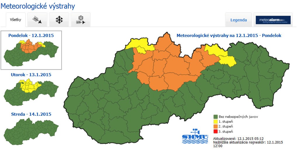 Výstrahy sa týkajú okresov Žilina, Martin Turčianske Teplice, Námestovo, Dolný Kubín, Ružomberok, Banská Bystrica, Tvrdošín, Liptovský Mikuláš, Brezno, Poprad a Kežmarok. SHMÚ tu od nadmorskej výšky 1300 metrov očakáva výskyt silného vetra, ktorý dosiahne v nárazoch rýchlosť 90km/h až 118 km/h. "Táto rýchlosť predstavuje zvýšené nebezpečenstvo pre ľudské aktivity. Predpokladaná rýchlosť vetra je v danej ročnej dobe a oblasti nadpriemerná a pravdepodobnosť spôsobenia škôd je vysoká," upozorňuje ústav.