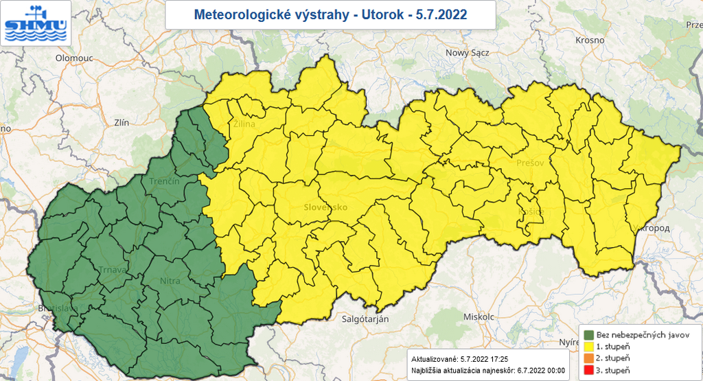 S výdatnejšími dažďami treba počítať na časti stredného a na východnom Slovensku až do stredajšieho (6. 7.) rána. Upozorňuje na to Slovenský hydrometeorologický ústav (SHMÚ) s tým, že naďalej platia výstrahy prvého stupňa pred búrkami.