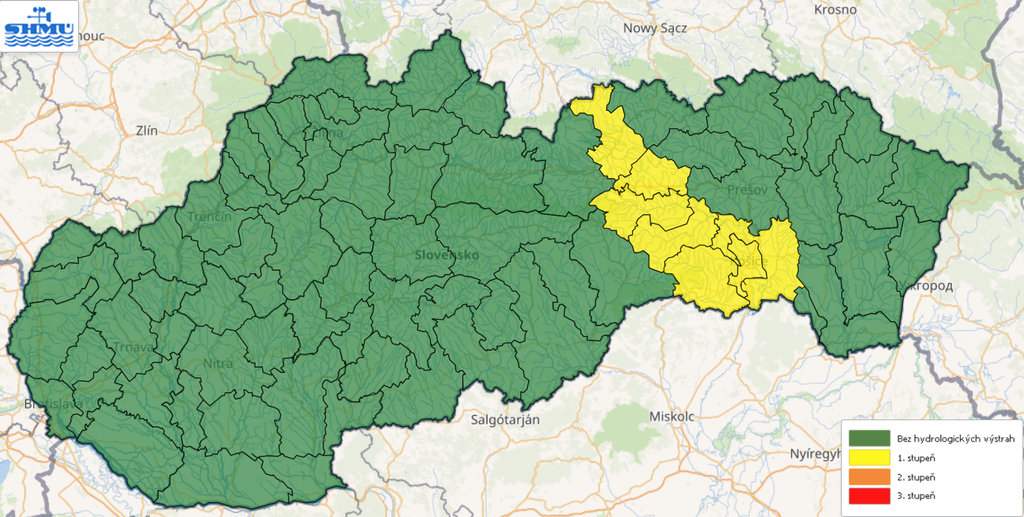 Meteorológovia zároveň vydali aj hydrologické výstrahy. Výstrahy druhého stupňa platia pre okres Skalica, výstrahy prvého stupňa pre okresy Kežmarok, Spišská Nová Ves, Gelnica, Levoča, Košice a tiež Košice-okolie - Hornád a Košice-okolie - Bodva.