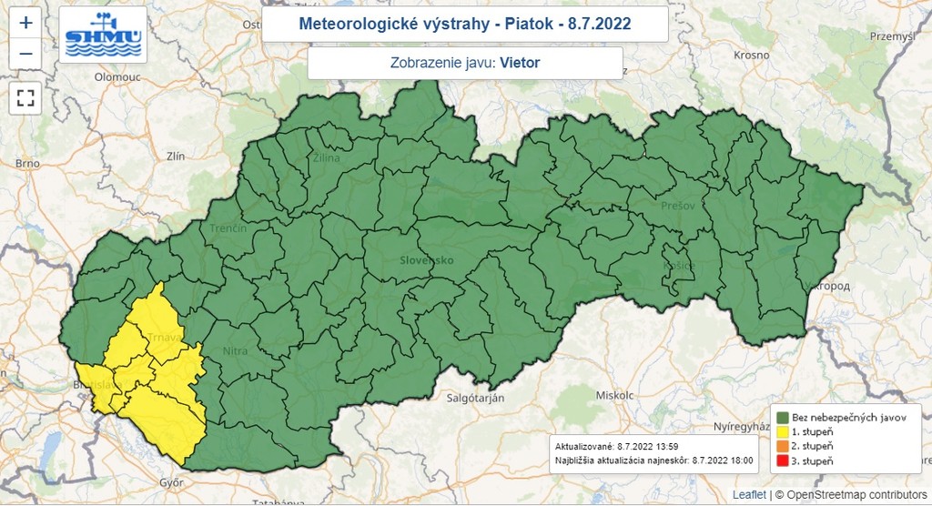 "Predpokladaná rýchlosť vetra je v danej ročnej dobe a oblasti bežná, ale môže spôsobiť škody menšieho rozsahu," upozornil SHMÚ.
