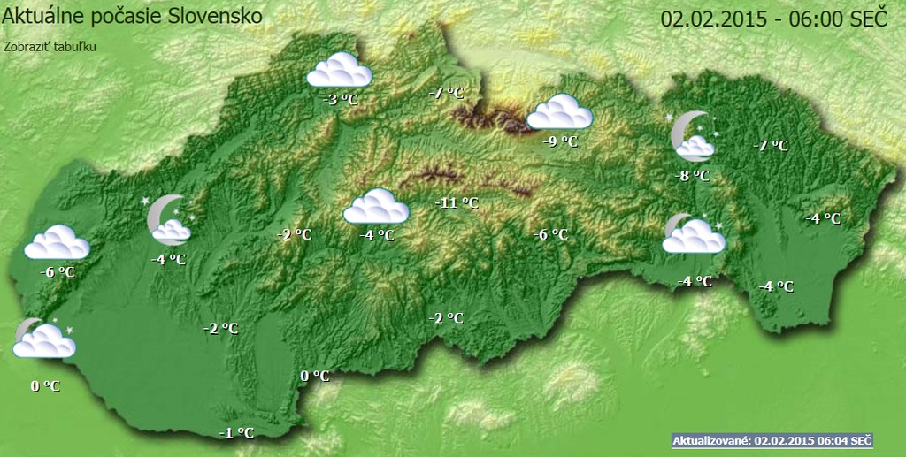Na východe Slovenska bude dnes tiež viac oblačnosti, cez ktorú sa však môžu predierať aj slnečné lúče. Miestami môže zo zatiahnutej oblohy slabo snežiť. Žiadne výdatné zrážky sa však neočakávajú. Pri slabom premenlivom vetre sa bude teplota pohybovať od -3 na severe, do 3 stupňov na juhu.