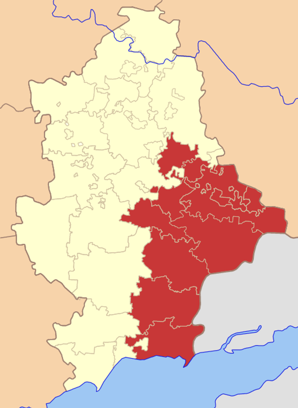 Červenou farbou sú vyznačené územia, ktoré v Doneckej a Luhanskej oblasti ovládajú separatisti: