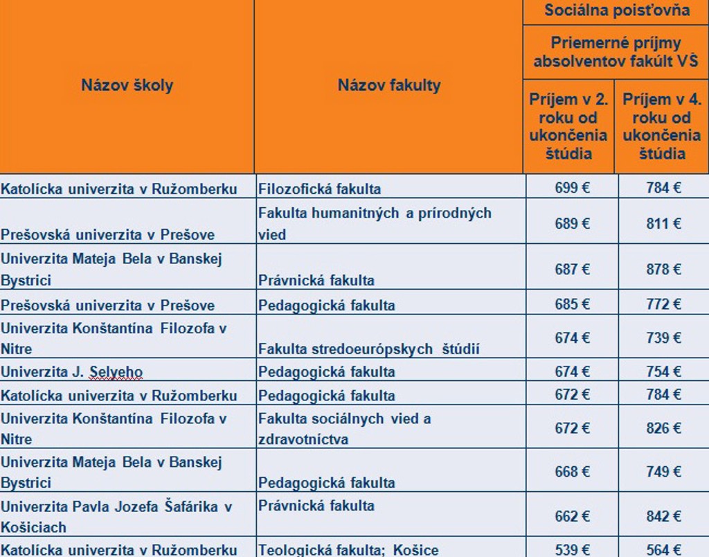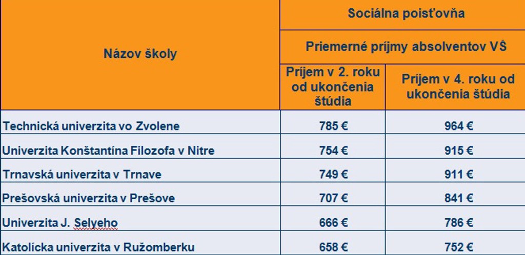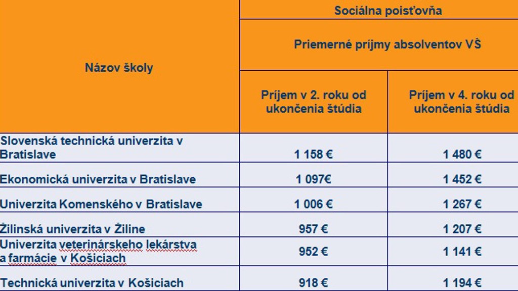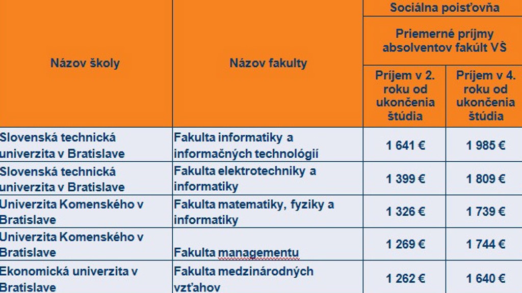 Centrum vedecko-technických informácií pracujúce pod ministerstvom školstva zverejnilo čiastočné rebríčky škôl a aj fakúlt podľa platov absolventov. Vychádza pri tom aj z údajov Sociálnej poisťovne, ktorá má prehľad o reálnych príjmoch ľudí.