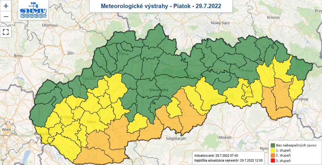 Výstraha prvého stupňa platí pre väčšinu okresov západného Slovenska a aj pre väčšinu okresov v južnej časti krajiny.