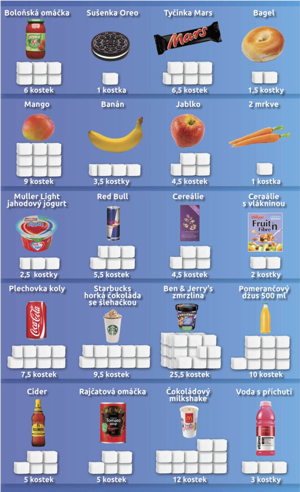 Pýtate sa, že ako je to možné? Cukor totiž obsahuje aj ovocie. Napríklad jablko obsahuje štyri a pol kociek cukru a mango dokonca deväť. Ale cukor v ovocí nie je to isté ako cukor v čokoláde alebo ovocných džúsoch. V ovocí je totiž viazaný v štruktúre, zatiaľ čo pridané cukry sú v jedle voľné a sú telu k dispozícii v omnoho väčších dávkach.