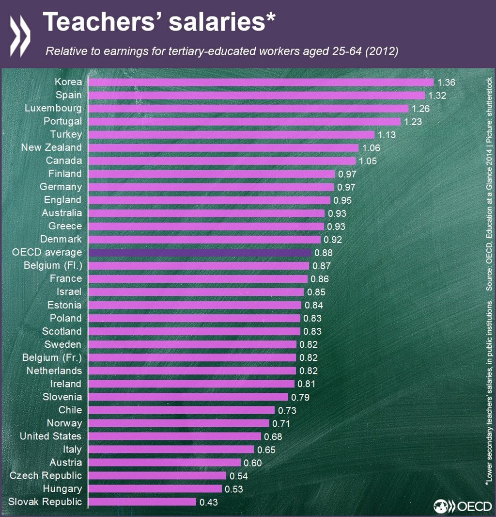 V správa informuje aj o platoch stredoškolských učiteľov. Na Slovensku, Maďarsku, či v Indonézii zarobia približne 14 000 eur ročne, zatiaľ čo v Holandsku, Švajčiarsku, či v Nemecku sa ročné platy pohybujú okolo cifry 56 000 eur. Na čele rebríčka sa umiestnilo Luxembursko, kde si učitelia zarobia do 90 000 eur.