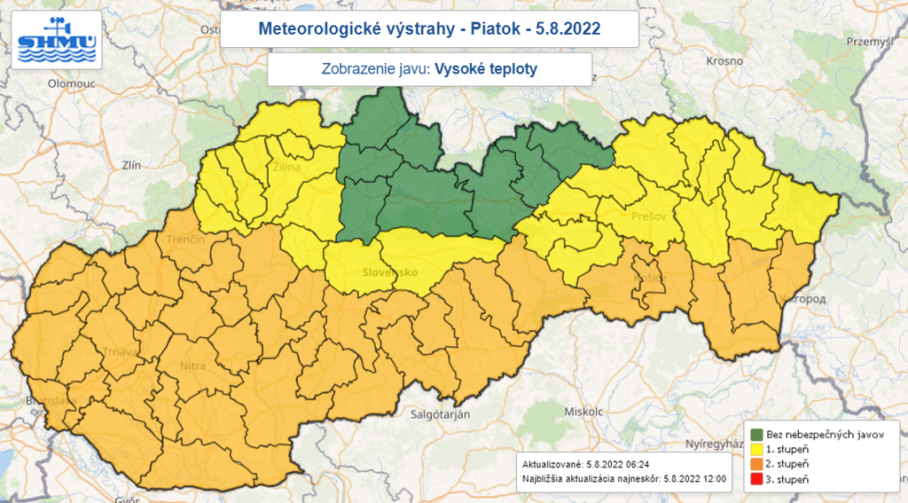Výstrahy druhého stupňa pred vysokými teplotami platia pre celý Bratislavský, Trnavský a Nitriansky kraj a tiež pre väčšinu územia Trenčianskeho, Banskobystrického a Košického kraja. Teplota tam môže popoludní vystúpiť na 35 až 36 stupňov Celzia.