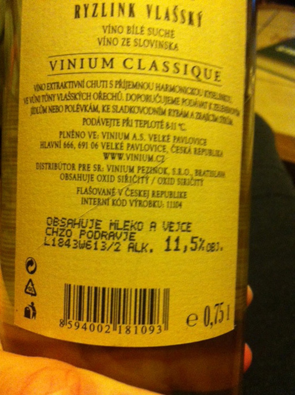 Keďže ide o alergény, vinári musia mlieko a vajcia uviesť na etikete hrubým písmom. Takýchto fľašiek nájdete v každom obchode hneď niekoľko. Upozornil nás na to náš čitateľ, ktorý nám na adresu [email protected] poslal aj fotografiu.