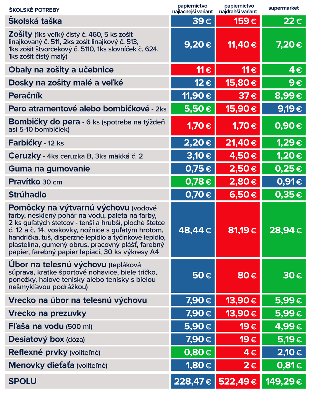 Ak si odmyslíte túto položku (úbor na telesnú výchovu), cenový rozdiel medzi najlacnejším sortimentom v papiernictve a nákupom v supermarkete je približne 60 eur.