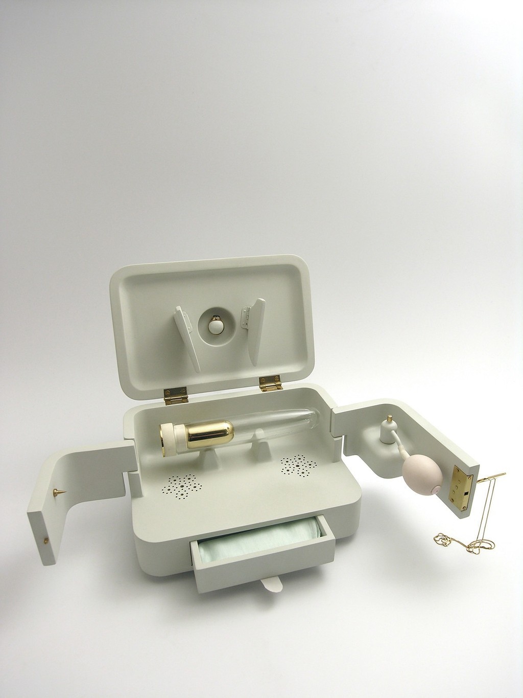 V skrinke okrem vibrátora nájdete aj nádobku na parfum, ktorý vám môže pripomínať partnerovu obľúbenú vôňu a tiež si môžete pustiť aj jeho obľúbenú hudbu prostredníctvom pripojenia na iPhone. Všetko je na zámok, takže sa k tomu dostanete len vy.