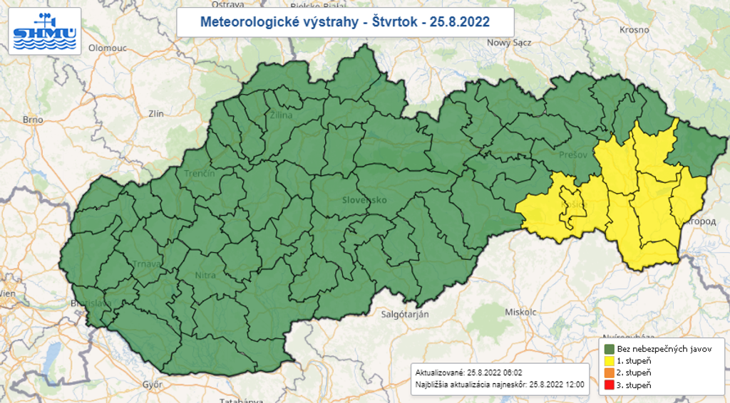 Výstraha platí od 14.00 do 18.00 h pre územie okresov Trebišov, Košice, Košice-okolie, Michalovce, Sobrance, Humenné a Vranov nad Topľou.
