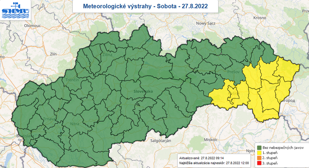 Výstrahy pred vysokými teplotami platia v sobotu popoludní pre viaceré okresy na východe Slovenska. Upozorňuje na to Slovenský hydrometeorologický ústav (SHMÚ) na svojom webe. Výstrahy platia do 18.00 h.