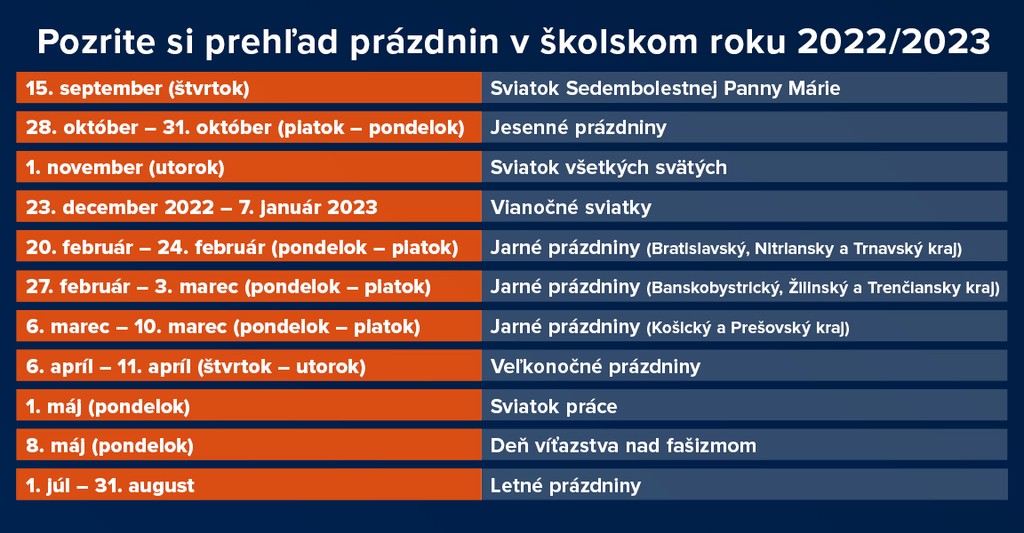 Prvé dlhšie prázdniny ich čakajú koncom októbra. Počas Vianočných sviatkov si oddýchnu 17 dní.