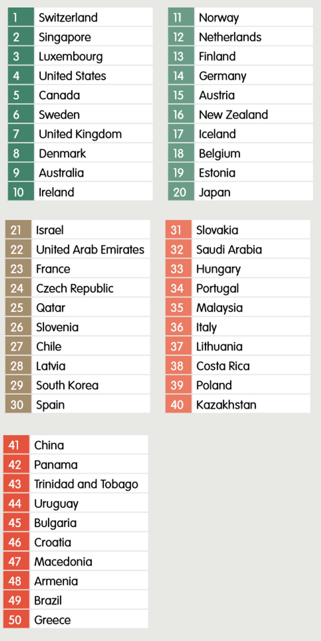 Na 1. mieste za rok 2014 sa umiestnilo Švajčiarsko, za ním nasleduje Singapur a medailovú trojicu uzatvára Luxembursko. Nie náhodou rebríčku dominujú malé vysokopríjmové ekonomiky. Ich prednosťou je otvorenosť trhu a investíciám.