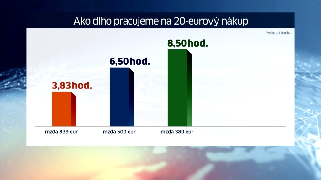 Priemerne zarábajúci Slovák pracuje na bežný 20-eurový nákup potravín tri hodiny a 50 minút. Vďaka cenovej stagnácii a mzdovému rastu je to zhruba o štvrť hodiny kratšie ako pred rokom. Ak na väčší nákup minie 50 eur, znamená to, že v práci musí stráviť viac než jeden pracovný deň. Nákup na celý týždeň za 100 eur stojí človeka viac ako dva dni v zamestnaní.