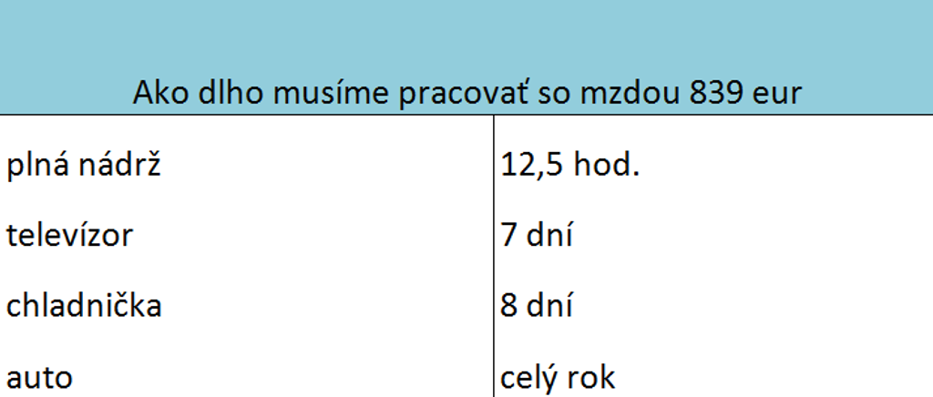 Slovák zarábajúci priemernú mzdu 839 eur pracuje na bežný nákup potravín v hodnote 20 eur takmer štyri hodiny. Na natankovanie plnej nádrže benzínu potrebuje stráviť v práci viac než 12 hodín a ak si chce dopriať televízor, odpracovať musí zhruba sedem dní.