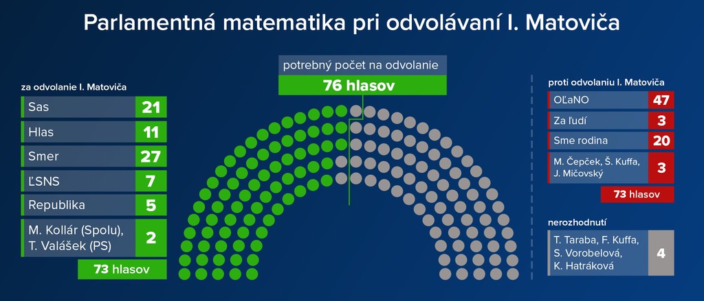 Po spočítaní je za odvolanie Igora Matoviča 73 poslancov, opozícii teda chýbajú ešte traja. Koalícia momentálne disponuje 70 hlasmi.