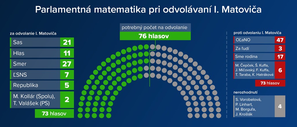 Summa summarum: Na odvolanie ministra je potrebných 76 hlasov. V parlamente by tak museli byť všetci poslanci, ktorí chcú odvolávať, plus by sa museli pridať minimálne ďalší traja poslanci. Nerozhodnutí môžu byť momentálne štyria.