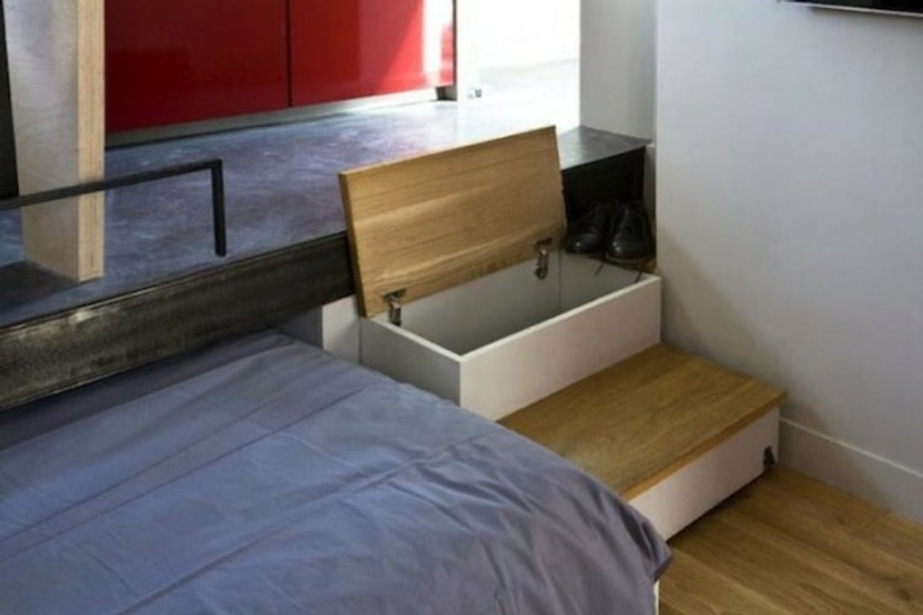Všetko v bytíku má svoje využitie a je prakticky riešené. Najvýraznejším prvkom je rozťahovacia posteľ, ktorá sa cez deň dá pretvoriť na sedačku tým, že ju ukryjete do vyvýšenej podlahy. Samozrejme, aj to chce nejaké finančné prostriedky, ale určite sa to oplatí. Pozrite sa na to.