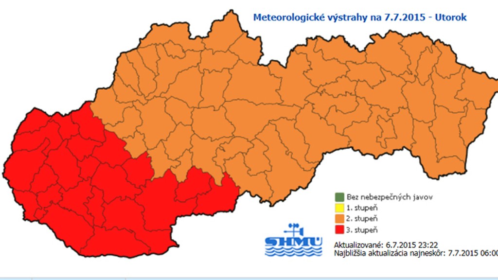Výstraha 3. stupňa platí od 12.00 do 19.00 h vo väčšine okresov západného a v niektorých južných okresoch stredného Slovenska. SHMÚ tu miestami očakáva dosiahnutie maximálnej teploty vzduchu 34 až 38 stupňov Celzia. Takáto vysoká teplota predstavuje zvýšené nebezpečenstvo pre ľudské zdravie, fyzické aktivity i tvorbu požiarov.