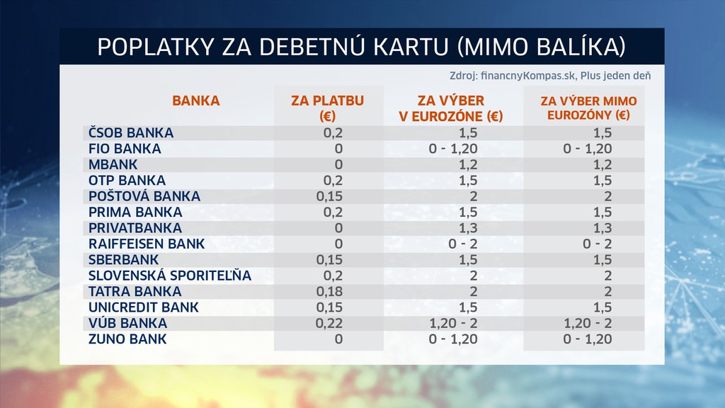 Všetko závisí od bankového balíčka držiteľa karty. Najvýhodnejšie je podľa denníka Plus jeden deň platiť kreditnou kartou, je to zadarmo. Za výber z bankomatu sa však platí. Pri debetnej karte sa poplatkom za platbu aj za výber nedá vyhnúť. Lacnejšie je však debetnou kartou platiť.