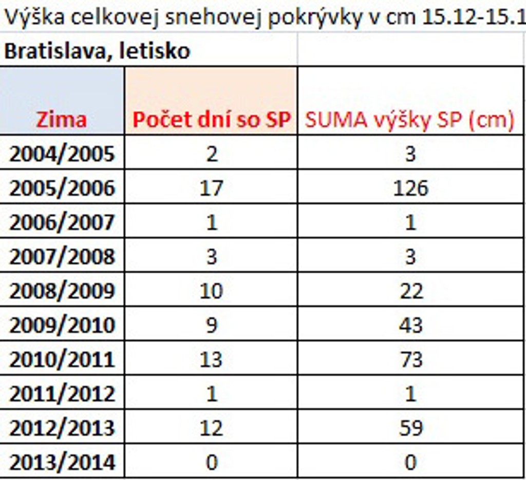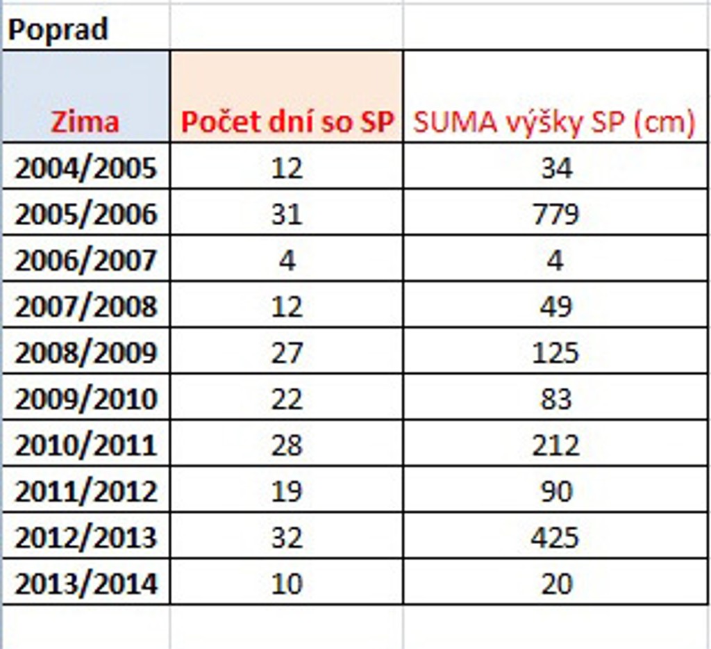 Na prelome rokov 2006 a 2007 boli v Poprade od 15. decembra do 15. januára len štyri dni so súvislou snehovou pokrývkou. V aktuálnej sezóne ich bolo desať, vyplýva zo štatistík Slovenského hydrometeorologického ústavu za predošlé desaťročie.