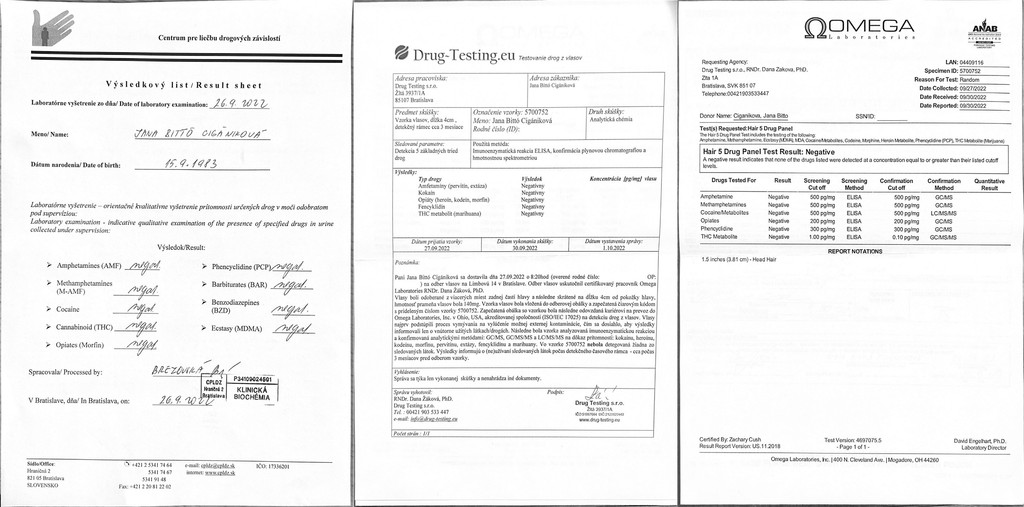 „Jeden vylučuje prítomnosť akýchkoľvek omamných látok 3-4 dni pred odberom, teda aj v čase incidentu. Test z vlasov vylučuje prítomnosť až 3 mesiace spätne,“ konštatuje na sociálnej sieti Bittó Cigániková.