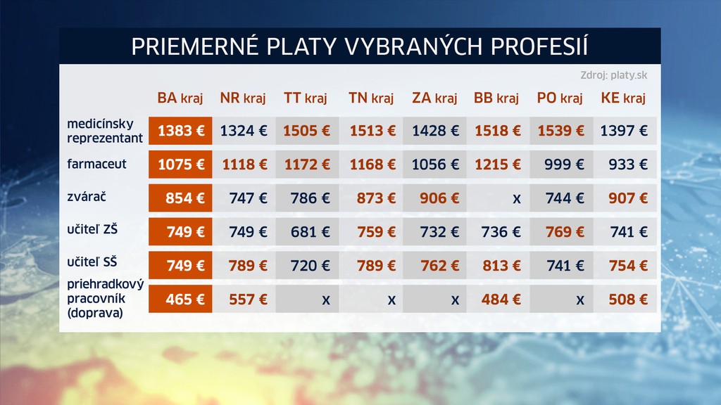 Rozdiely v platoch pritom nie sú malé. Najviac to vidno pri medicínskych reprezentantoch. Kým v Bratislave zarobia v priemere 1383 eur, tak v Banskej Bystrici aj o 200 eur viac. Podobní prípad sú aj farmeceuti.