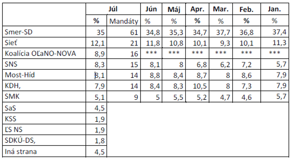 V prieskume, ktorý sa uskutočnil v dňoch 12.7. - 18.7., prvé miesto obsadil vládny SMER s 35 percentami. Za ním nasleduje Sieť, ktorá sa prehupla cez 12 percent. Tretia skončila spomínaná koalícia vedená Igorom Matovičom a Danielom Lipšicom.