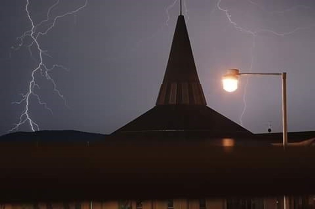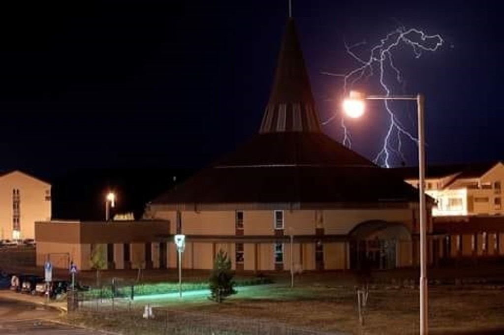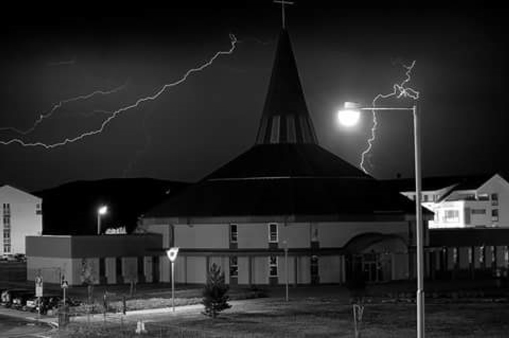 Andrej Gašparin urobil sériu fotografií v Senici. Kostol sv. Cyrila a Metoda v popredí, za ním blesky. Nádhera.