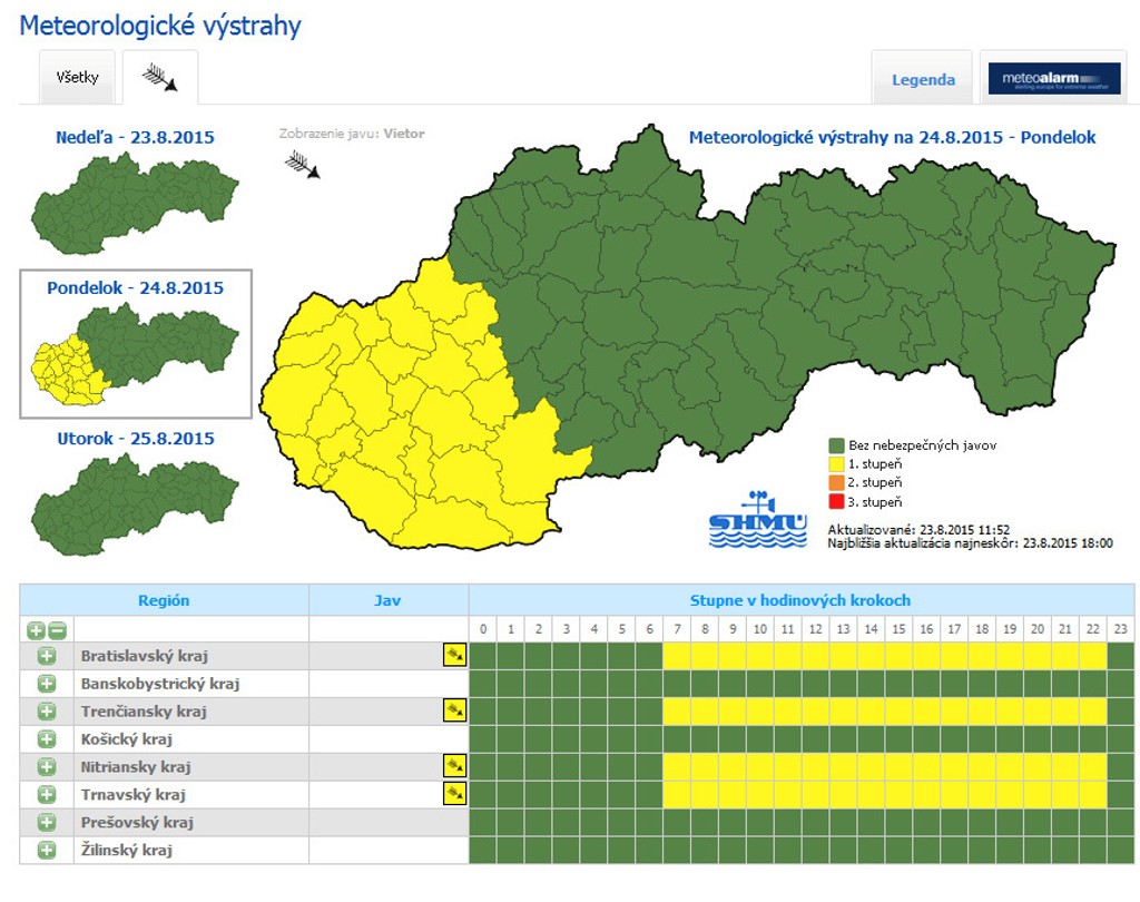 Západné Slovensko zasiahne v pondelok 24. augusta silný vietor. Slovenský hydrometeorologický ústav (SHMÚ) preto na tento deň vydal výstrahu 1. stupňa, ktorá potrvá od 7.00 do 23.00 h. Meteorológovia očakávajú výskyt vetra, ktorý dosiahne krátkodobo v nárazoch rýchlosť 17 až 22 metrov za sekundu.