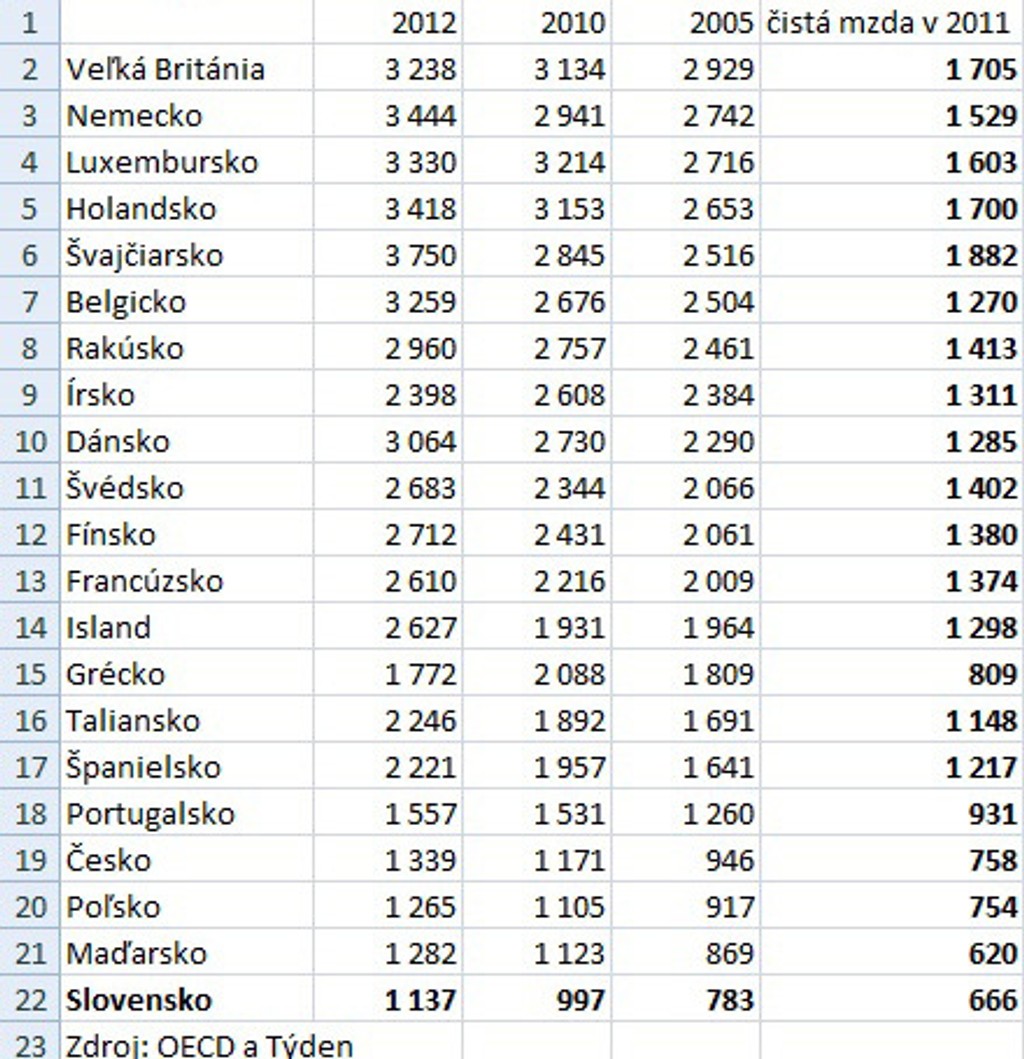 Od roku 2005 do 2012 sa síce naša priemerná hrubá mzda prepočítaná cez paritu kúpnej sily (zohľadňujú sa ceny v danej krajine, teda koľko si reálne za plat možno kúpiť) zvýšila asi o 350 eur, no stále sme sa nedostali ešte ani na úroveň padajúceho Grécka.