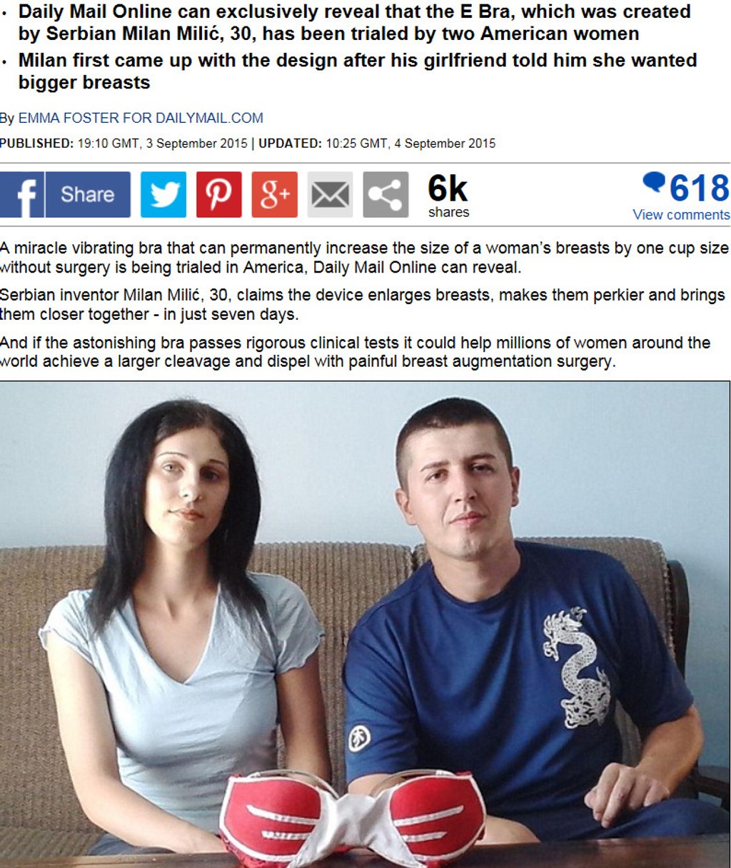 Nakoniec sa Milanovi podarilo vymyslieť špeciálnu podprsenku, ktorá bezbolestne a rýchlo prsia zväčší. Funguje vďaka vibráciám, ktoré prsia v raste podporujú a navyše krásne tvarujú. Stačí ju nosiť trikrát denne päť minút po dobu jedného týždňa a výsledok je ohromujúci. Prsia navyše pritlačí bližšie k sebe a vytvorí medzi nimi sexi medzierku, po ktorej túži každý muž.
