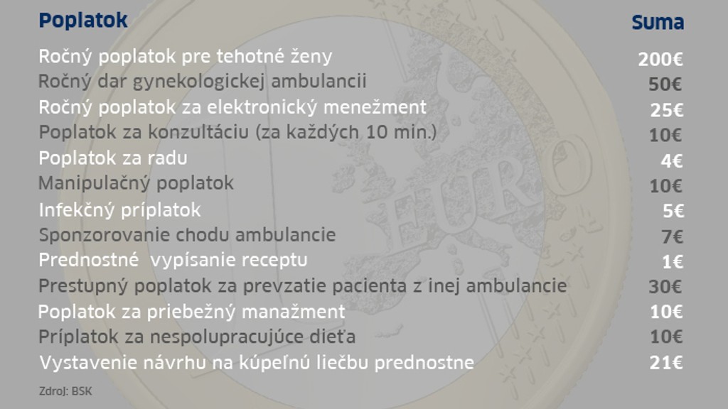 BSK uvádza, že podľa novely zákona, ktorá má priniesť poriadok do poplatkov, sú lekári povinní odoslať cenník na kraj. Doteraz to robiť nemuseli. Sú v nich uvedené poplatky, ktoré priamo nesúvisia s poskytovaním zdravotnej starostlivosti. Za zdravotné výkony peniaze brať nesmú.