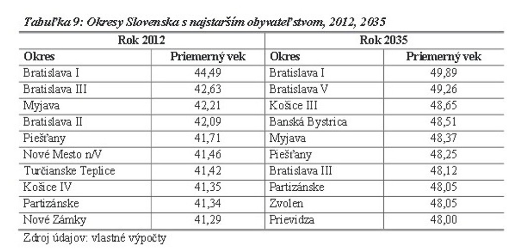 Najstaršími ostanú aj o dvadsať rokov okresy z hlavného mesta. V prvom bratislavskom okrese stúpne priemerný vek z necelých 45 na takmer 50 rokov: