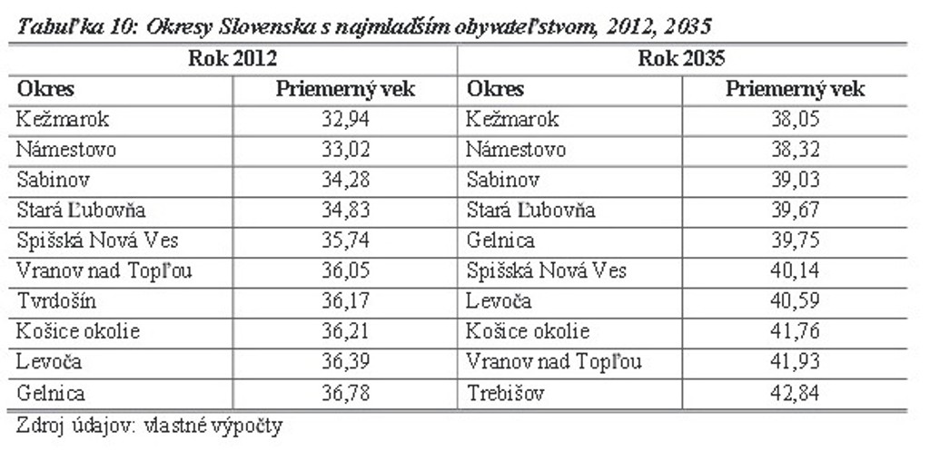Do roku 2035 sa priemerný vek obyvateľstva vo všetkých okresoch zvýši v priemere o sedem rokov, vyplýva z najnovšej predpovede Výskumného demografického centra, Prognostického ústavu Slovenskej akadémie vied a Prírodovedeckej fakulty Univerzity Komenského.