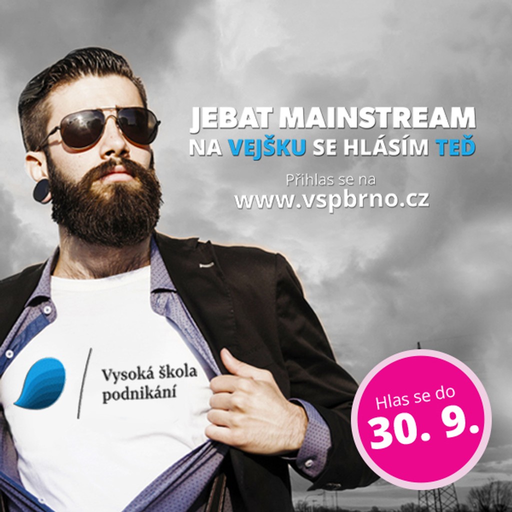 Česi opäť šokujú odvážnou reklamnou kampaňou. O rozruch sa tentoraz postarala súkromná Vysoká škola podnikania v Brne. Jej hlavný slogan v kampani, ktorá má získať nových študentov znie: „J*b*ť mainstream." A reklamný spot je ešte šialenejší: