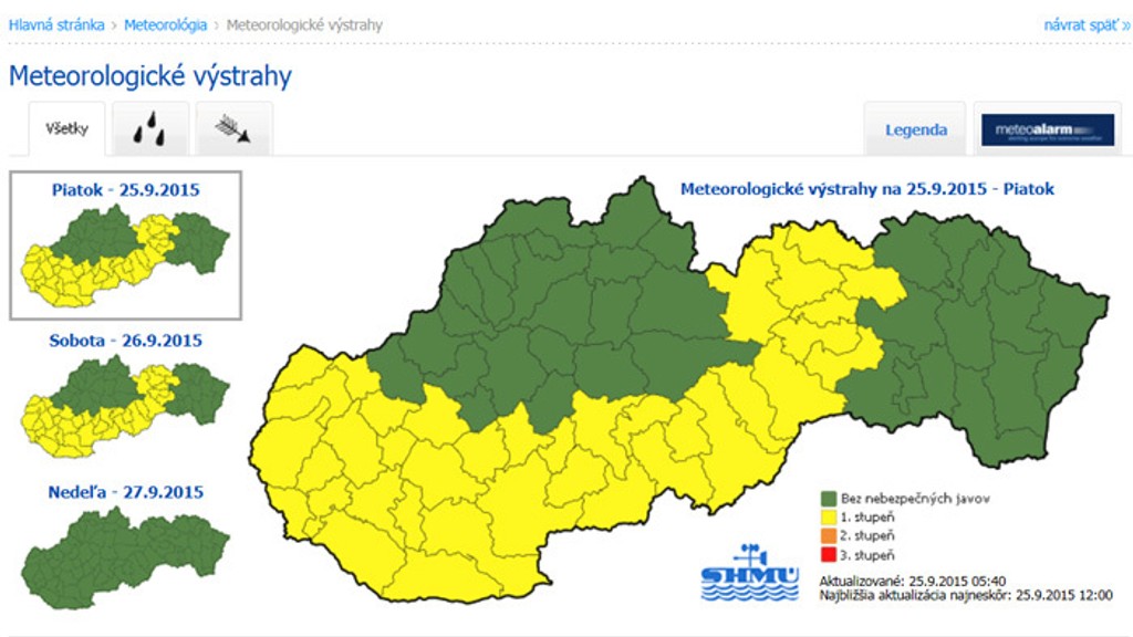 Slovenský hydrometeorologický ústav varuje pred intenzívnym dažďom, ktorý dnes môže zasiahnuť časť západného, stredného i východného Slovenska. SHMÚ preto vydal výstrahu 1. stupňa, ktorá platí do soboty (26.9.) 06.00h.