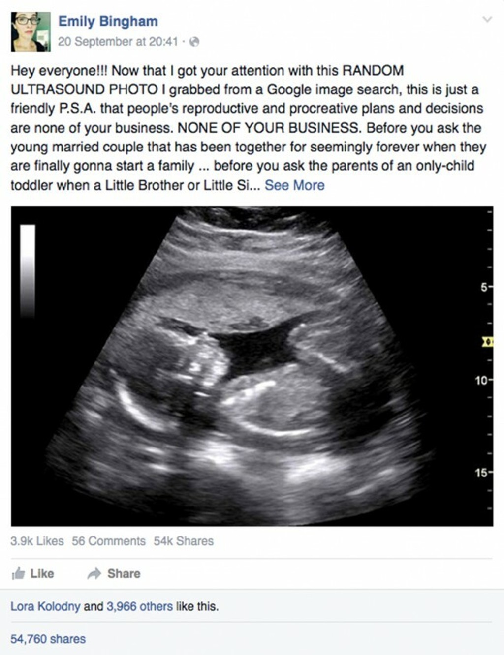 "Ahojte všetci!!! Teraz, keď som zaujala vašu pozornosť týmto obrázkom bábätka z ultrazvuku, ktorý som si vygooglila, tak vám len chcem oznámiť, že akékoľvek reprodukčné a a plány na plodenie iných ľudí vás nemusia vôbec zaujímať. Nič vás do nich nie je," napísala.