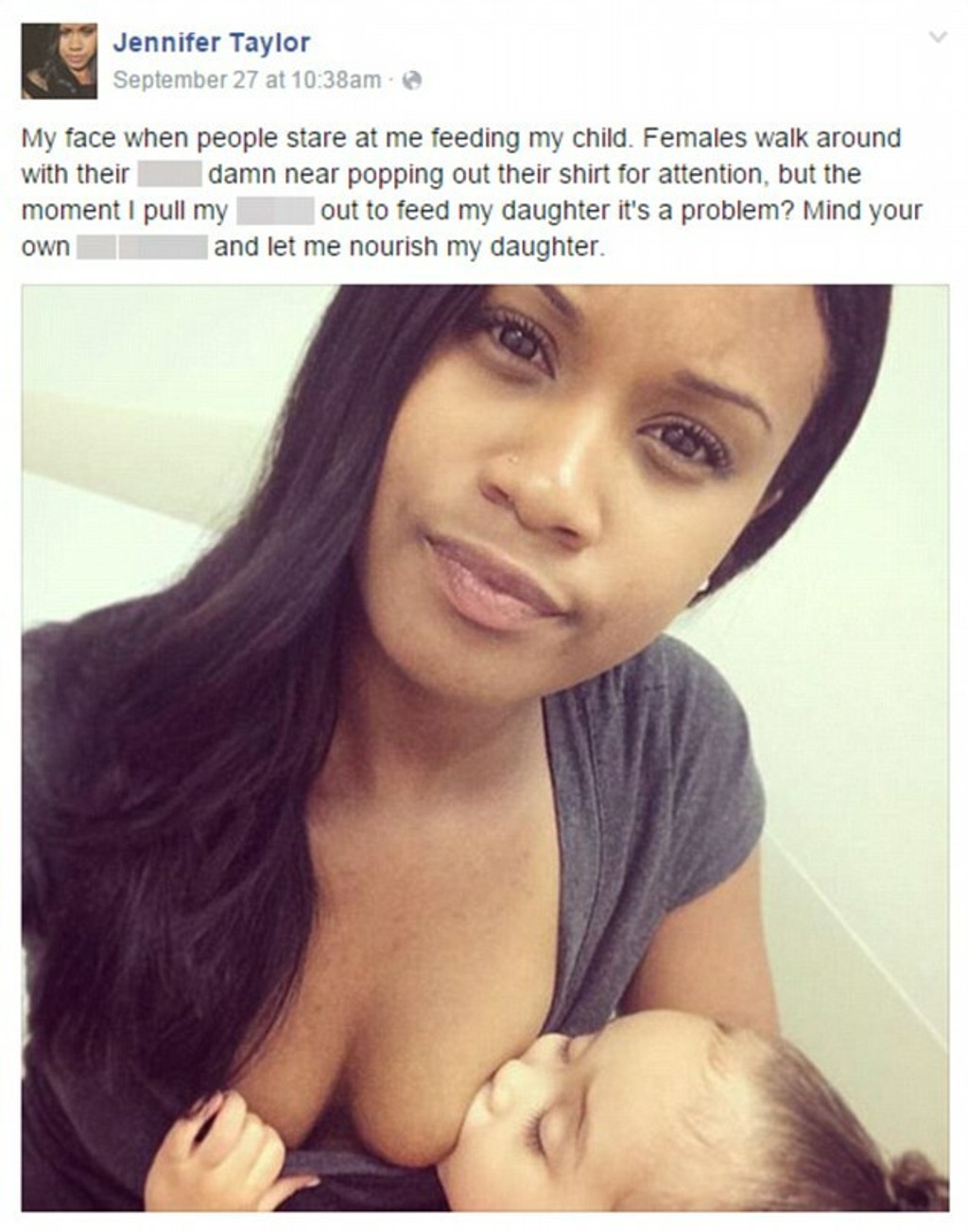 „Takto sa tvárim, keď ľudia na mňa „čumia" počas dojčenia dcéry. Keď ženy vzbudzujú pozornosť vyzývavými outfitmi, to je v poriadku, no keď kŕmim dcéru, to už je problém? Zamyslite sa nad sebou a nechajte ma nakŕmiť dieťa," napísala Jennifer na Facebook.