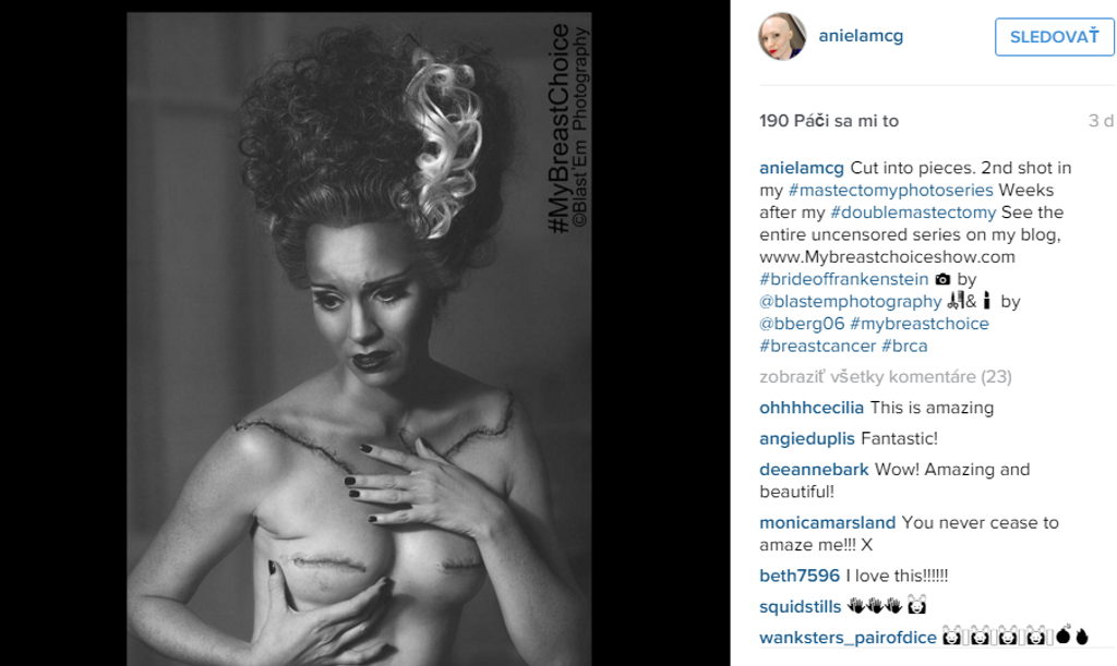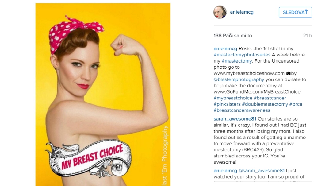 Aniela McGuinness je 32-ročná herečka z Floridy, ktorej v septembri 2014 diagnostikovali rakovinu prsníkov. Američanka sa zdrvujúcu správu dozvedela len niekoľko dní pred plánovanou preventívnou mastektómiou.
