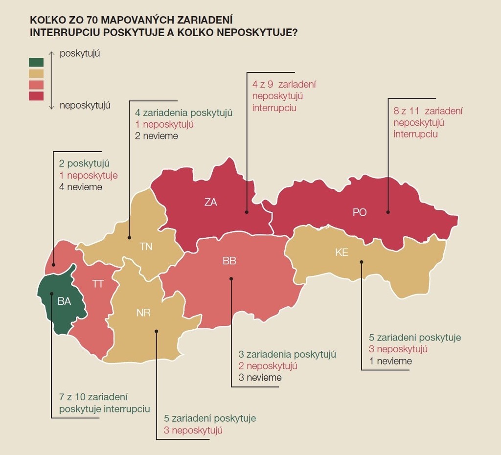 Podľa politologičky Adriany Mesochoritisovej sa situácia v krajoch veľmi líši. „Najlepšia dostupnosť služieb je v Bratislavskom kraji, najhoršia v Žilinskom a Prešovskom kraji. Tam neposkytuje interrupcie až 8 z 11 zariadení,“ povedala s tým, že najčastejším dôvodom, prečo zdravotnícke zariadenia odmietajú vykonávať interrupciu, je ich náboženské presvedčenie.